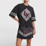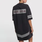 Robe t-shirt coupée dans mon tissu jersey épais lavé. Conçu avec une illustration « ALIX CLUB » à l’avant et une œuvre « 2014 » à l’arrière. Avec deux rayures blanches sur chaque manche.