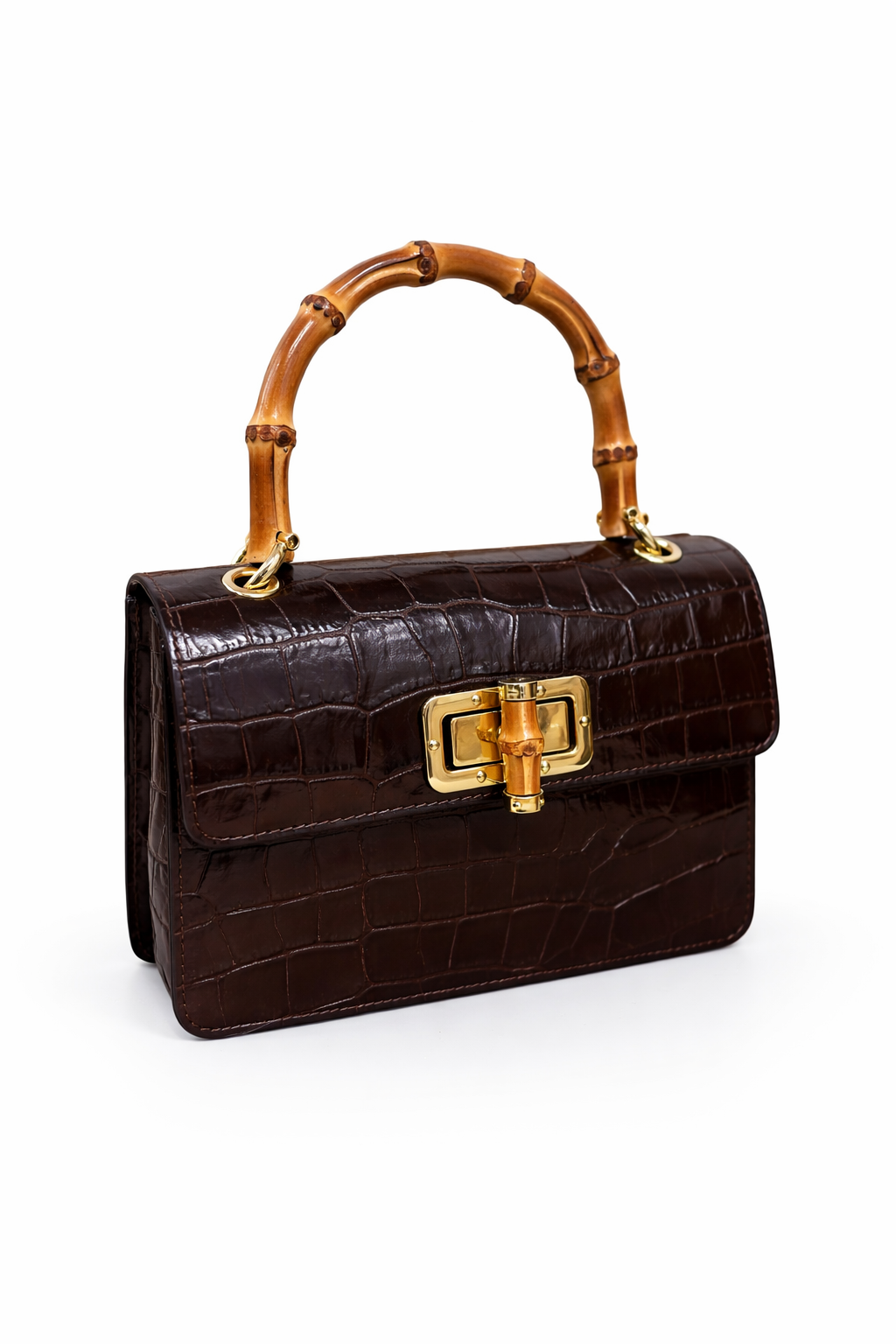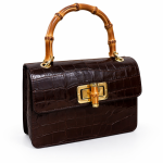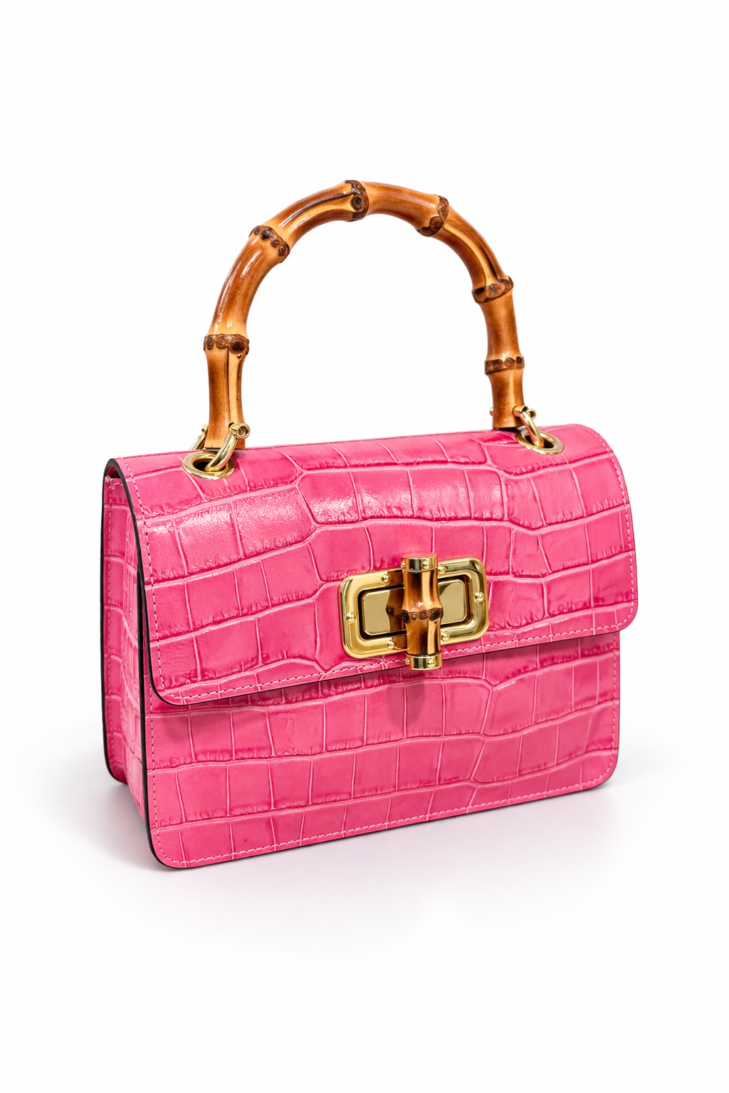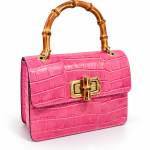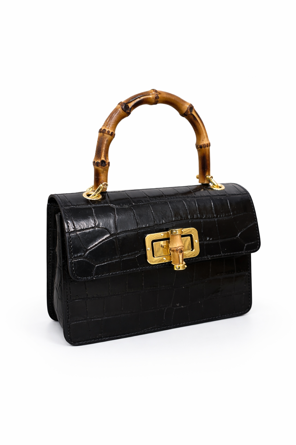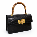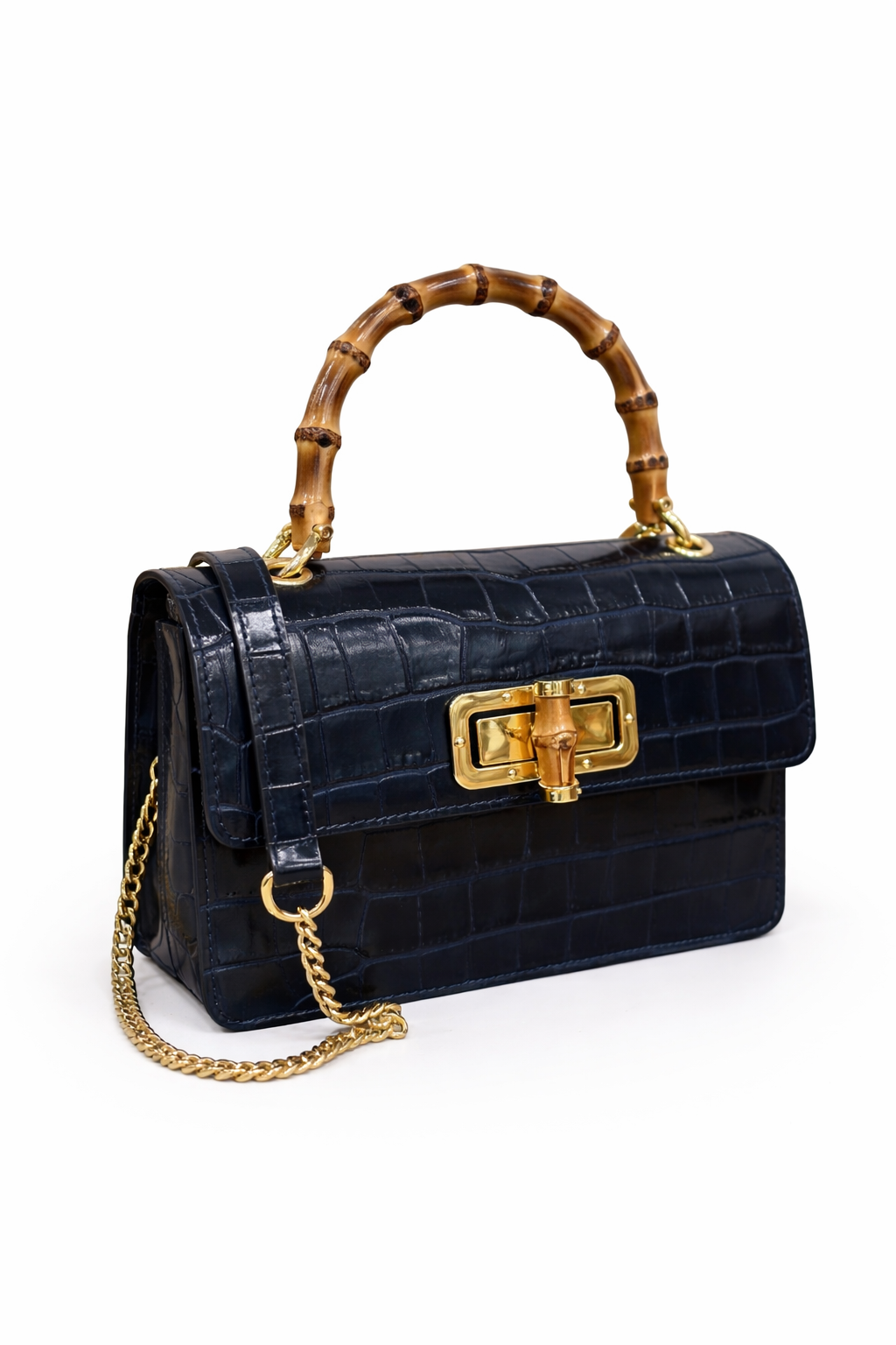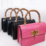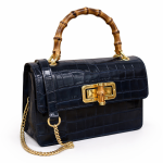 Sac à main en effet croco finition brillant avec pognée rigide en bambou naturel, fermoir doré avec également des détailles de bambou, à ça ce rajoute aussi la bandoulière en chaine doré . Disponible en différentes coloris : Noir , Bleu marine et Rose .