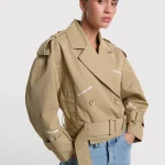 • Trench-coat légèrement court, taillé dans un tissu de trench un peu cripeux. Conçu avec une ceinture au bas de l’ourlet. Avec des broderies « ALIX » partout.